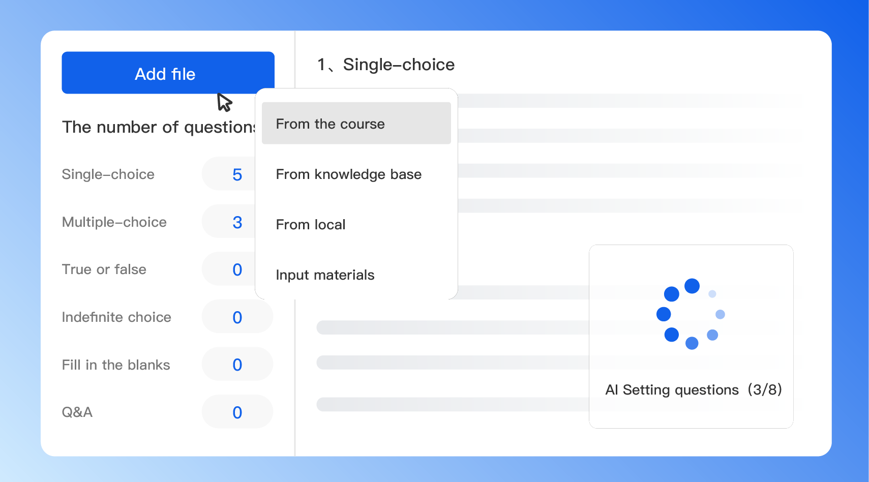AI 出題:通過深度解析培訓材料(如產(chǎn)品手冊、文化手冊),自動生成選擇題、判斷題等題型,同步更新題庫;根據(jù) “地區(qū)員工語言能力”“崗位技能重點” 智能調整試題難度與題型占比,適配差異化考核需求。
