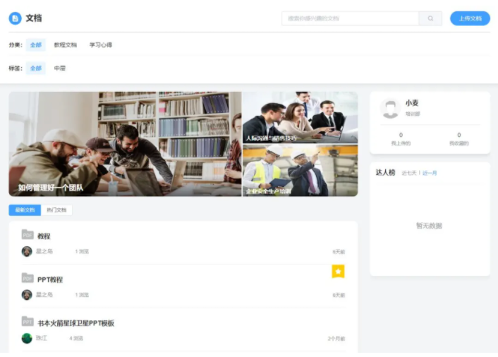 員工可在“文檔”板塊上傳有價(jià)值的文檔資料,支持pdf/doc/docx/ppt/pptx/xls/xlsx文件格式,多種文檔格式滿足知識(shí)共享。企業(yè)通過(guò)這個(gè)板塊建立了流動(dòng)的企業(yè)知識(shí)庫(kù),同時(shí)上傳的文檔均由管理者審核通過(guò),規(guī)范知識(shí)庫(kù)管理,保證了文檔的質(zhì)量,打造一個(gè)有料有趣的知識(shí)庫(kù)。