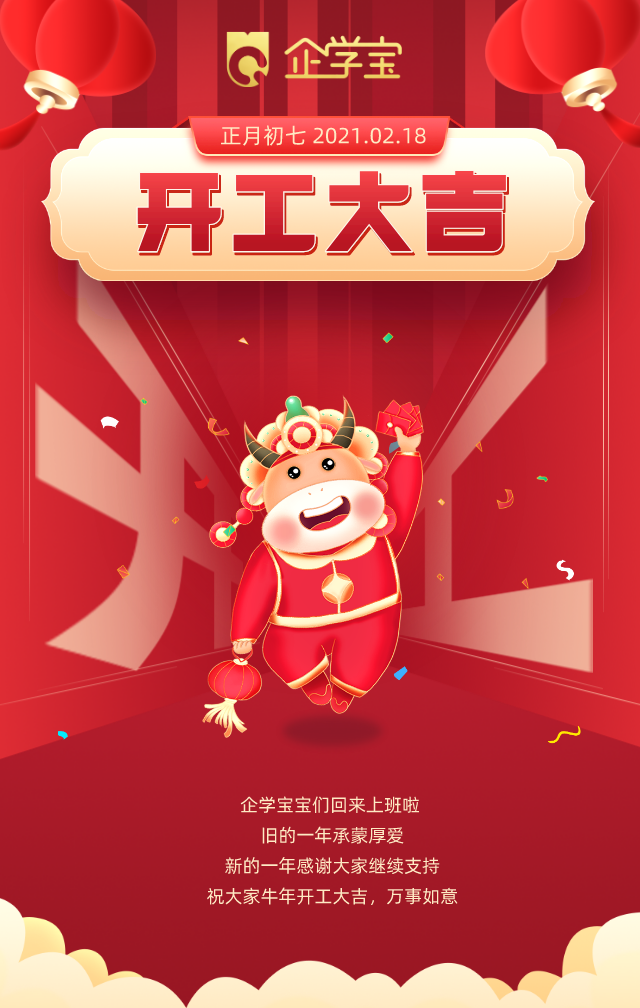 開工啦!企學(xué)寶祝各位新老朋友牛年大吉!身體康??!生意興?。?