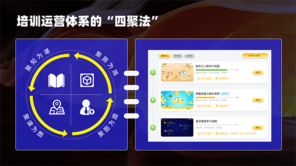 聚課成圖是指把課程和考試等學(xué)習(xí)及關(guān)聯(lián)任務(wù)梳理為學(xué)習(xí)任務(wù)包聚攏成學(xué)習(xí)地圖。除此之外,企學(xué)寶還將大量培訓(xùn)課程以圖文形式展示,讓培訓(xùn)更加簡(jiǎn)單易懂。它以實(shí)際問(wèn)題為出發(fā)點(diǎn),建立對(duì)于新技術(shù)、新模式的整體認(rèn)知,達(dá)到了思想上的統(tǒng)一,在此基礎(chǔ)上進(jìn)一步提升員工的技能水平,能夠滿足企業(yè)的升級(jí)要求。通過(guò)解決員工工作中遇到的具體問(wèn)題,最終形成了一個(gè)有效的培訓(xùn)過(guò)程。