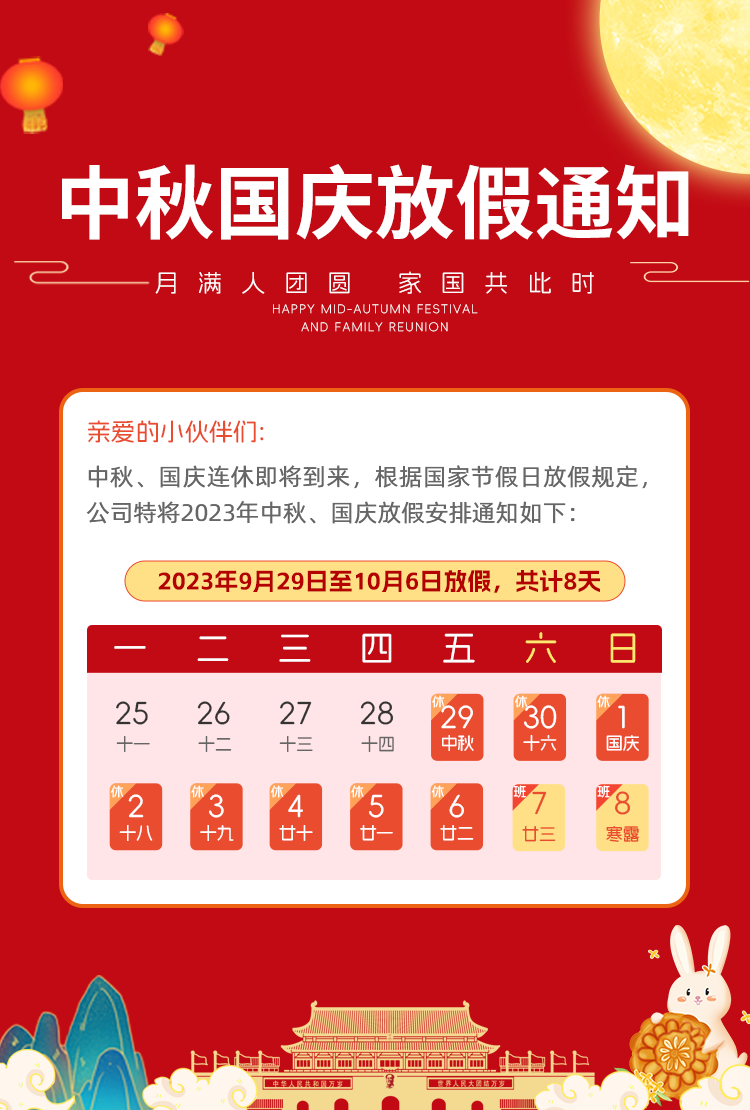您們好!根據(jù)《國(guó)務(wù)院辦公廳關(guān)于2023年部分節(jié)假日安排的通知》要求,我司2023年中秋節(jié)和國(guó)慶節(jié)放假通知安排如下: