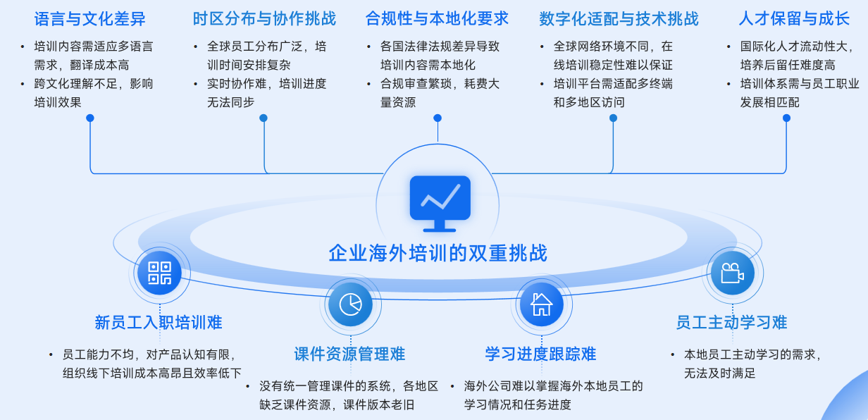 4. 培訓(xùn)資源與運營能力不足:很多企業(yè)并未在海外設(shè)置專職培訓(xùn)團隊,導(dǎo)致課件陳舊、學(xué)習(xí)進程無法跟蹤、新員工融入緩慢,更談不上與企業(yè)戰(zhàn)略真正掛鉤。
