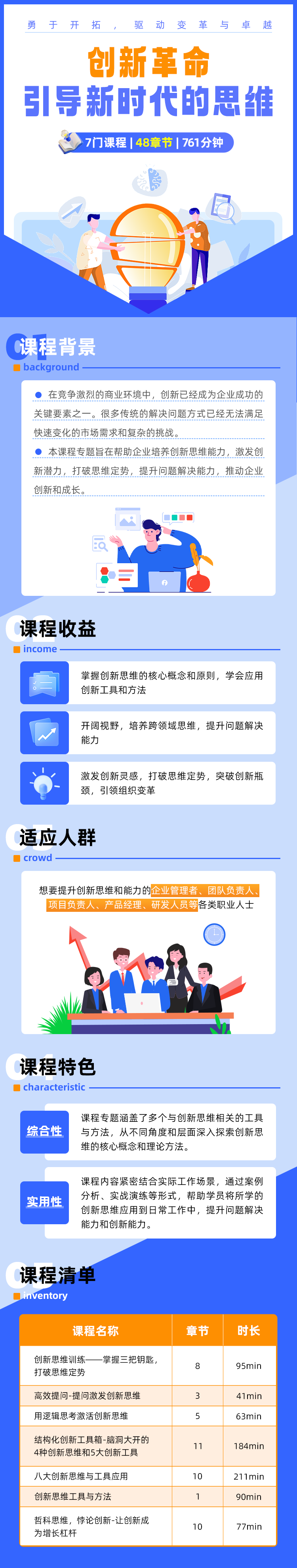 為助力企業(yè)提升創(chuàng)新思維能力,打造頂尖核心競爭優(yōu)勢,企學(xué)寶重磅推出《創(chuàng)新革命:引導(dǎo)時代的思維》專題課程包,涵蓋了7大門、48章節(jié)、761分鐘的課程,搭載多個思維提升工具及方法論,內(nèi)容緊密結(jié)合實際工作場景,通過案例分析、實戰(zhàn)演練等形式,幫助企業(yè)全體員工從多維度、多層面深入探索創(chuàng)新思維的奧秘,搭建高效實用的創(chuàng)新思維知識體系。