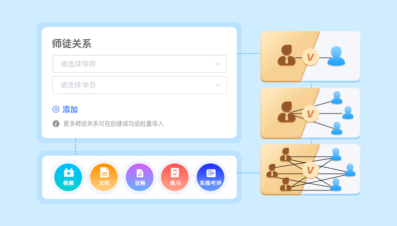 在帶教計劃中,導(dǎo)師可以上傳視頻、音頻、文檔、練習(xí)、實操考評等諸多載體形式,最大化豐富帶教內(nèi)容;也可以針對線上、線下不同教學(xué)場景要求,借助企學(xué)寶強大的數(shù)智化學(xué)習(xí)體系,實現(xiàn)跨越不同地域限制,實時指導(dǎo)學(xué)員的理論與實踐進步。
