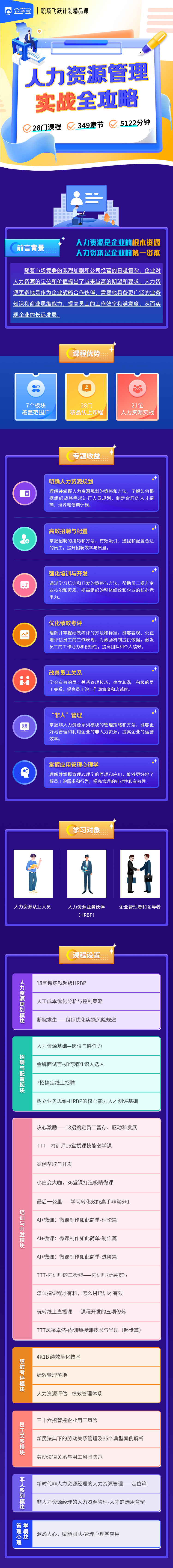 為了滿足人力資源從業(yè)者對(duì)于管理經(jīng)驗(yàn)和技能提升的需求,企學(xué)寶聯(lián)合多位名師打造了職場飛躍計(jì)劃精品課系列“人力資源管理實(shí)戰(zhàn)全攻略”課程包,其中涵蓋28門課程、349個(gè)章節(jié)、85小時(shí),不僅有人力資源最前沿的理論,更有諸多翔實(shí)豐富的實(shí)戰(zhàn)案例,兼具內(nèi)容豐富度與理論適用性,覆蓋從人力資源戰(zhàn)略規(guī)劃到員工離職管理的全應(yīng)用場景。讓學(xué)員在復(fù)雜多變的市場環(huán)境中,快速掌握各種人力資源管理工具和方法,提高工作效率和成果。