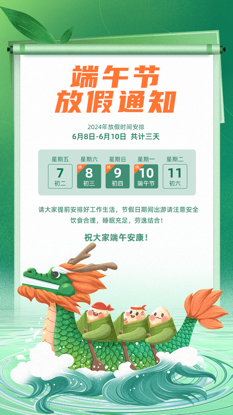 在放假期間,如因消息回復(fù)不及時(shí)給您帶來不便,敬請(qǐng)諒解。同時(shí),也希望大家能夠在端午節(jié)期間盡情享受與家人相聚的歡樂時(shí)光,感受傳統(tǒng)文化的魅力!